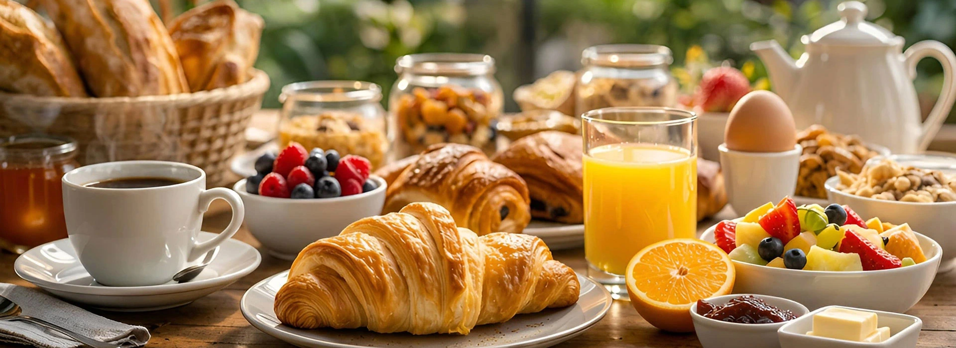 Puis vient le plaisir des tartines et des premières gourmandises. Notre boulanger nous livre chaque matin une sélection de pains frais, accompagnés de croissants et de viennoiseries.